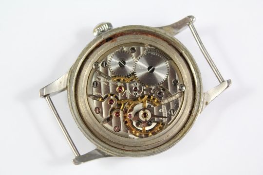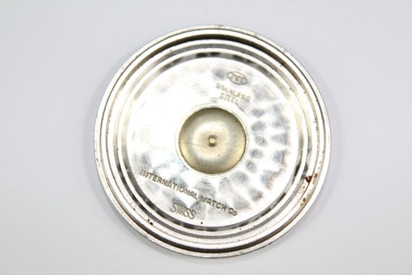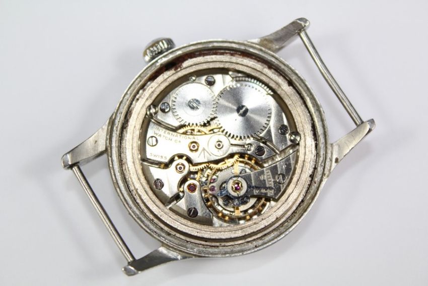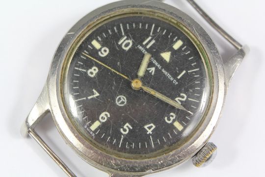 A Gentleman's Vintage Military Issue IWC Mark VI Wrist Watch. The watch having a black face with numeric dial marked with T-Tritium and the broad arrow, inscribed to back with the broad arrow mark and numbered 6B/346 and 611/50, mechanical manual-winding stainless steel watch, no straps. The movement is numbered 1205492.