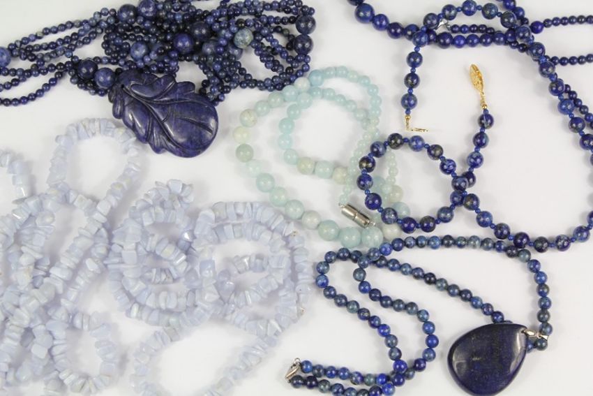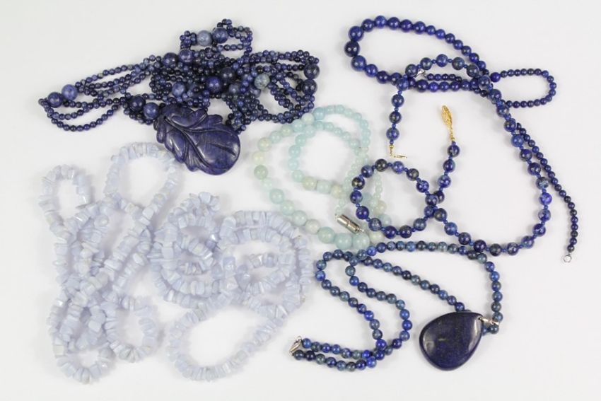 Lapis Lazuli and Blue Stone Necklaces: a Chinese style lapis lazuli necklace depicting fruit, approx 70 cms, together with a single lapis lazuli pendant necklace, approx 925 clasp, approx 44 cms, a single strand necklace approx 44 cms, a single strand graduated necklace on 925 clasp, approx 44 cms, two pale lilac stone necklaces, approx 80 cms, a blue quartz necklace on magnetic clasp, approx 40 cms. (7)