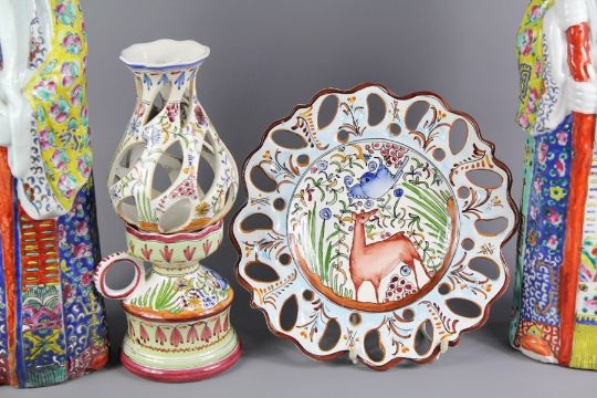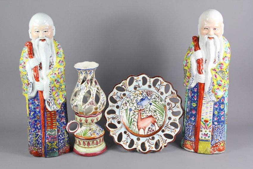 A Collection of Pottery: the pottery lot comprises two Chinese Sage figures with walking sticks, approx 44 cms high, together with a two-piece Portuguese table lamp with label beneath Sec.XVII-51 initials I.F.' approx 28 cms h and a decorative plate with pierced decoration to rim, approx 26 cms dia. (4)