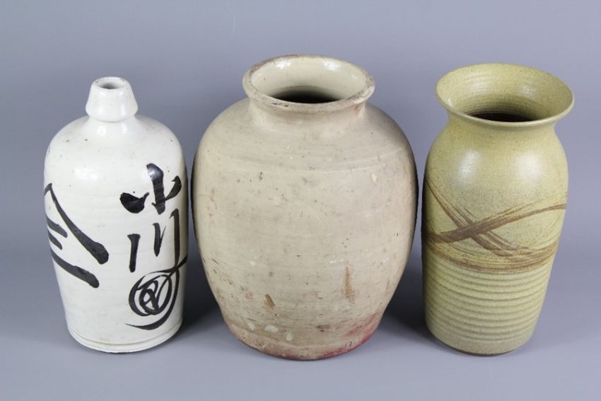 Three Studio Pottery Pots, including a Japanese Cream-Glazed Flagon, approx 27 cms h, an oat-meal glazed approx 26 cms h and a large un-glazed pot approx 27 cms h. (3)