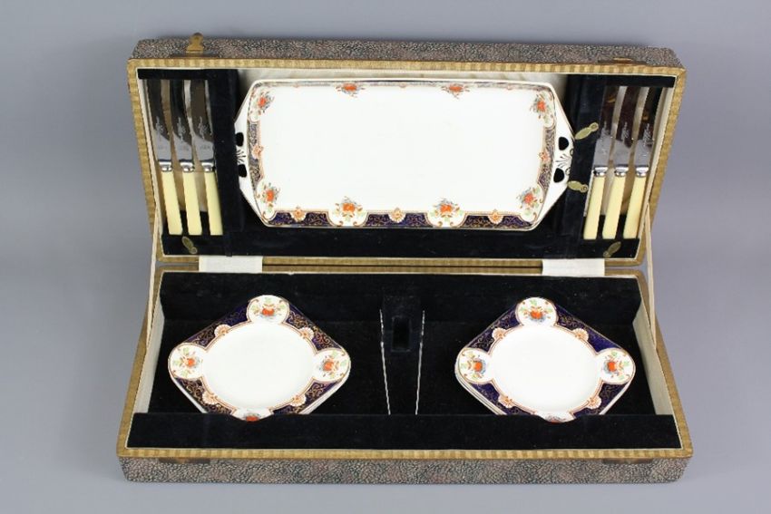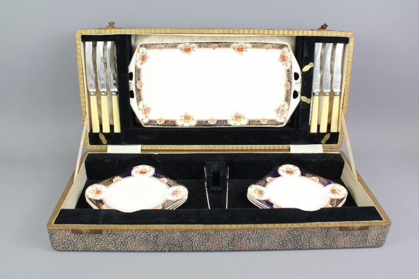 Vintage Woods 'Montrose' Sandwich Set; together with six fruit knives and chrome-plated serving tongs, in the original box.