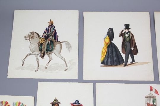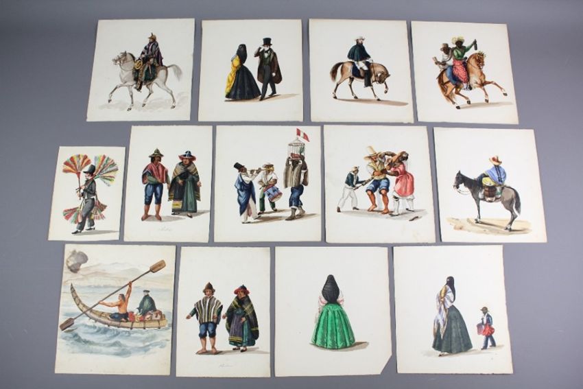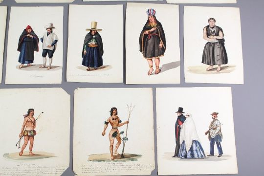 A Charming Collection of 19th Century Watercolours, depicting Costume of The South America's, including Bolivia, Argentina and Peru amongst others, approx ten original watercolours of the indigenous population and fourteen of the colonial population, unframed.