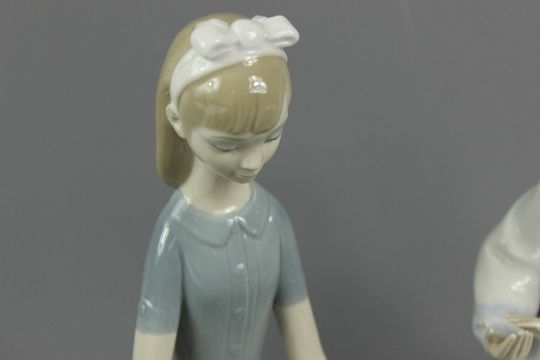 Lladro porcelain figures, including mother and child nr 5449 approx 23 cms together with girl feeding doves approx 22 cms.
