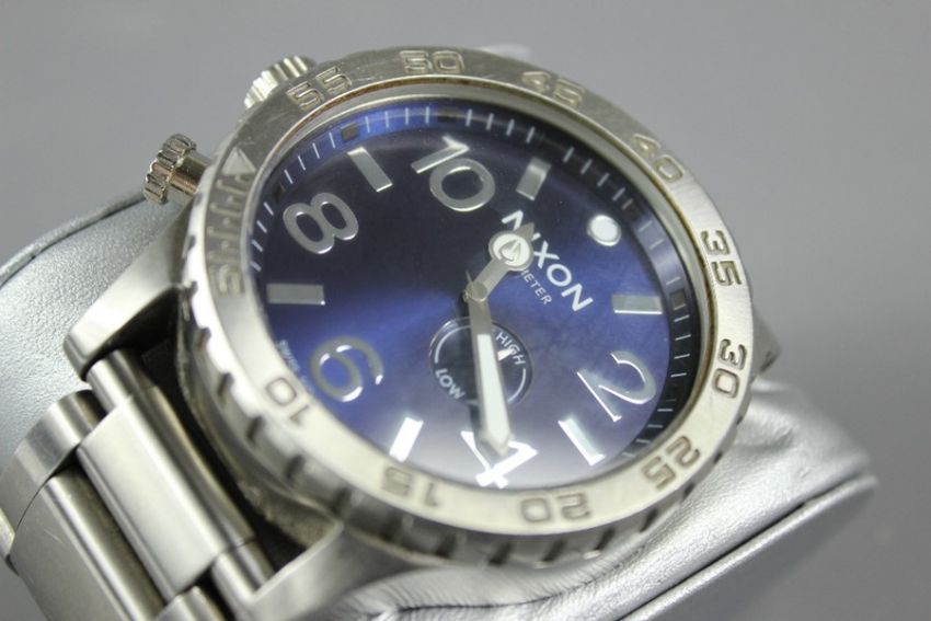 Stainless Nixon Tide watch, with blue face with baton and Roman dial, stainless steel bezel on stainless Nixon bracelet with concealed clasp, for tidal observation for fishermen and surfers.