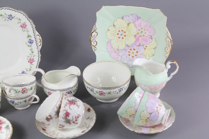 Three part tea sets, including Tuscan China 'Plant' one sandwich plate, one cake plate, milk jug, six cups and saucers, seven side plates nr 7424; Minton 'Ancestral' six bowls, six side plates, one cake plate, six cups and saucers, milk jug, sugar bowl and Aynsley 'Floral' twelve side plates, twelve saucers, ten cups, milk jug, sugar bowl and two sandwich plates.