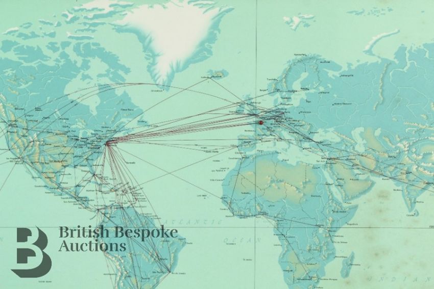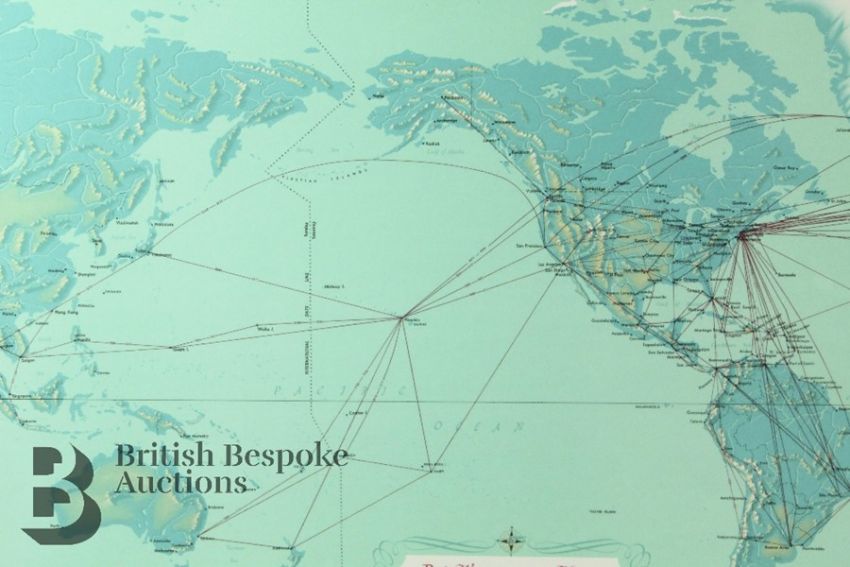 A Pan American Clipper Club world map showing flight routes and destinations of Pilot Walter B. Wentz. The map is framed, measuring 79cm in length and 55cm in height.