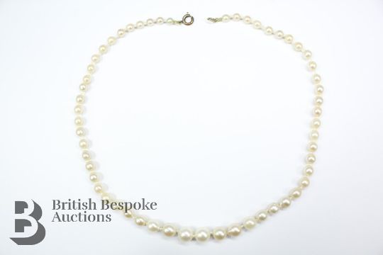 Graduated pearl necklace, pearls measure from 4mm d to 8 mm d, length of the necklace is approx 41 cms.
