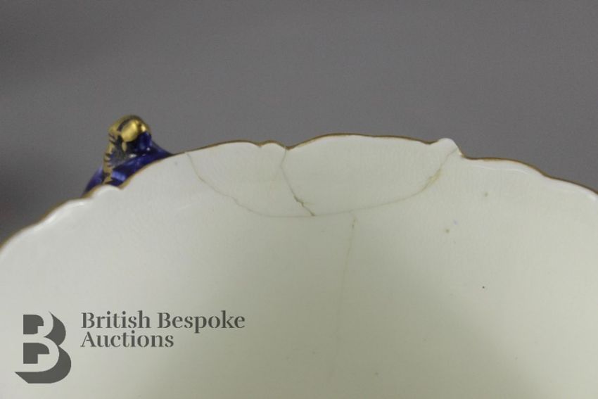 Four Crown Derby porcelain, including an oval trinket dish and cover nr 1128 LIII, a Crown Derby milk jug approx 9 cms h and an oval pin dish approx 11 cms d nr 1128 XIXX together with a 19th century Crown Derby Tryg, nr 2712. (af)
