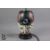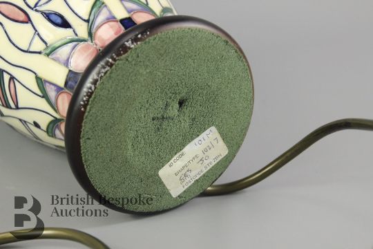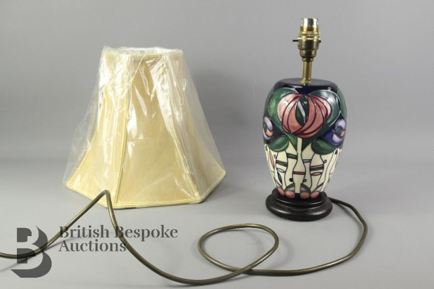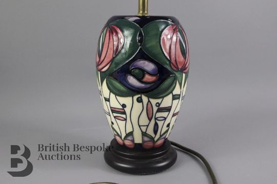 A Moorcroft lamp base with a geometric stylised pink, white, green and purple floral design. ID code 101M, style 102/7. The lamp measures 30cms in total. The lamp base is in good condition with no cracks or breakages, small scuff to wood base, untested.