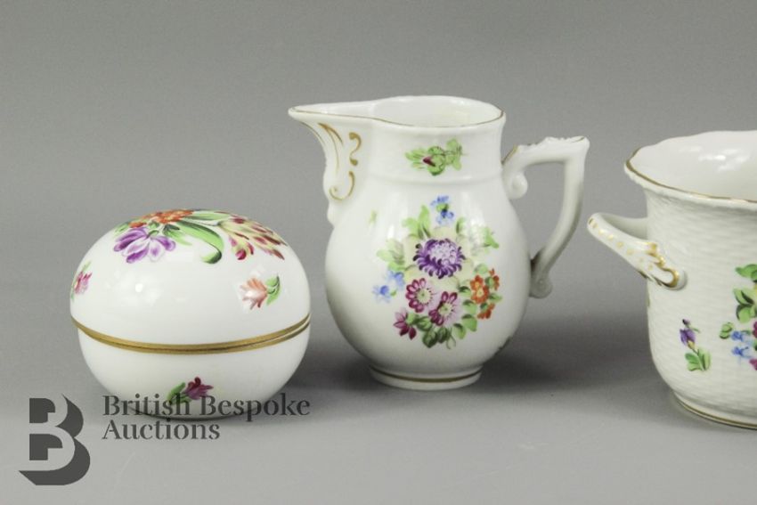 A collection of Herend porcelain, including a small trinket dish and cover, a mini jardiner, 12cm bud vase and small 9cm milk jug with Herend markings to bases. All in excellent condition with no chips or breakages.