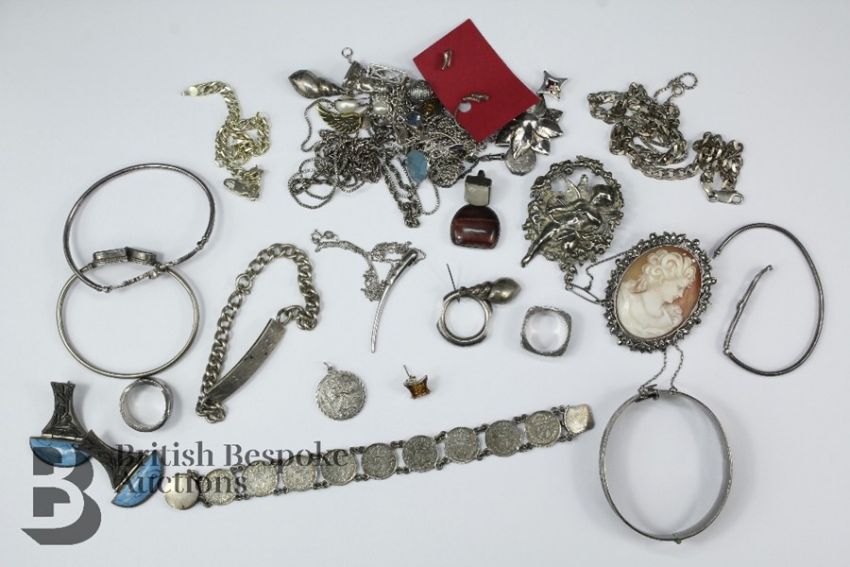 Miscellaneous silver jewellery, including ID bracelet, a silver Art Nouveau style stamped 925, bangle stamped 925, a pair of turquoise and silver earrings stamped 925, silver bangle with blue stone stamped 925, silver St Christopher pendant, coin bracelet, chain stamped 925 approx 46 cms, three heavy rings stamped 925, bracelet stamped 925,