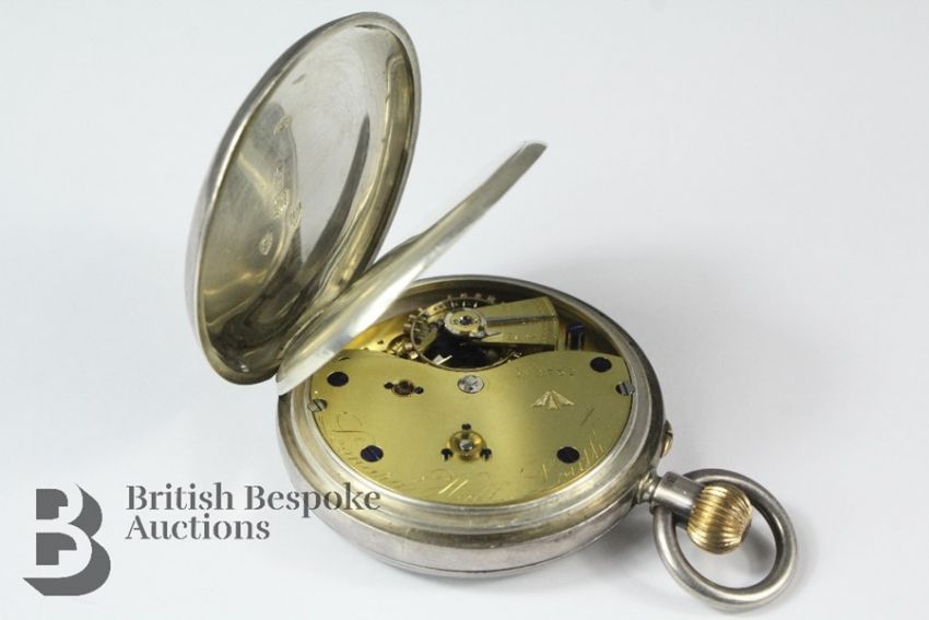 Leonard Hall silver self-wind open faced pocket watch, white enamel face, Roman hour dial with blued hands, case stamped London hallmark, dated 1894, mm JW,, face measures approx 50mm.