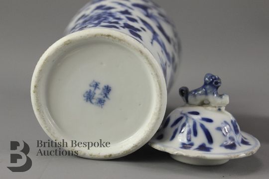 Chinese 19th Century blue and white vase, painted with flowers and birds, foo dog finial, approx 24 cms h, character marks to base.