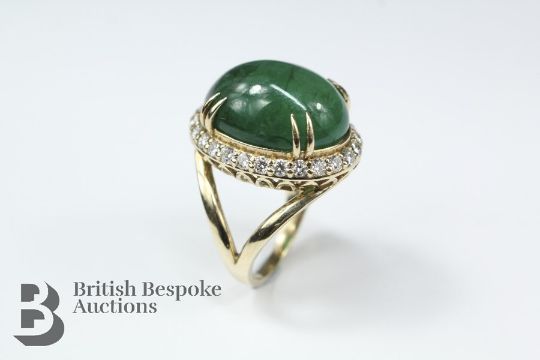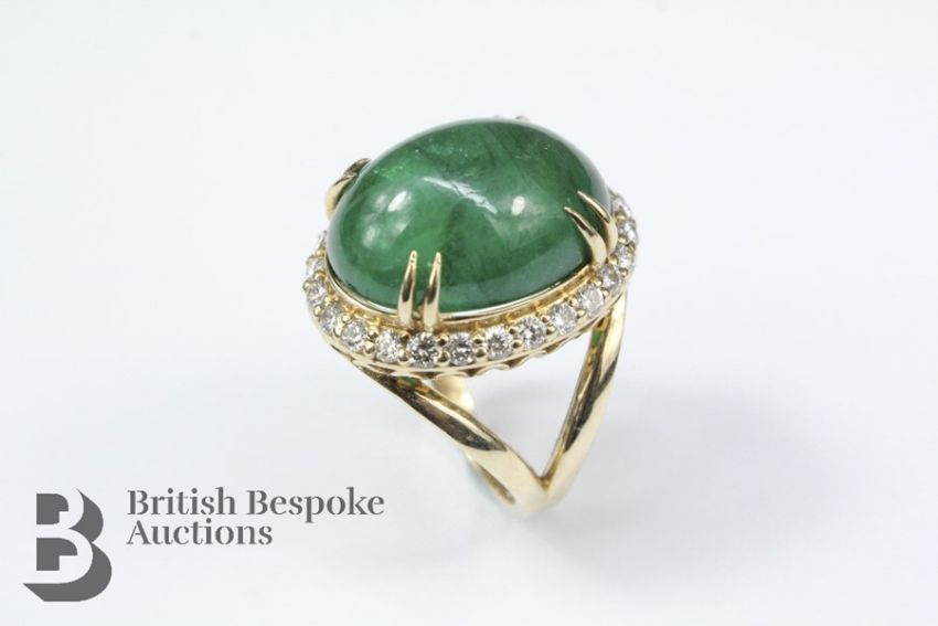 Exquisite 18.2ct cabochon emerald and diamond, the 18ct yellow gold ring set with an emerald cabochon approx 19 x 14 mm nesting on a band of approx 90 pts of dias, colour VVS1, colour F/G, size M+, approx 10.4 gms in an illuminated box.