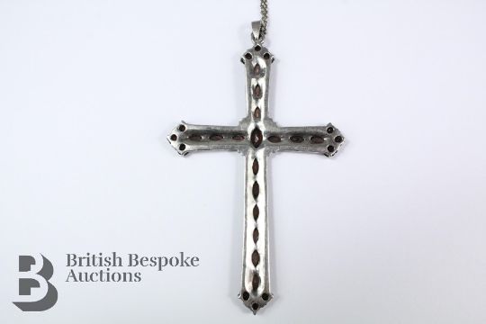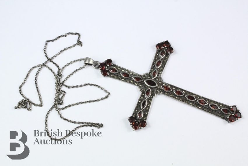 Silver and tourmaline cross necklace, the cross measures approx 10 x 6.5 mm, on a sterling silver chain, approx 56 cms, 27.3 gms.