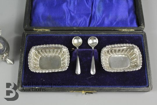 Silver cruet set comprising sugar caster (af), pepperette, mustard and salt, Birmingham hallmarks with various dates together with boxed salts.