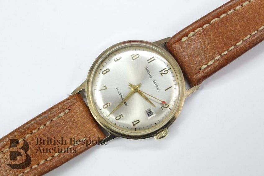 Gentleman's 9ct Gold Smiths Astral wristwatch, the watch having champagne face with numeric dial and date aperture, the case back engraved, 17 jewel movement nr 36C0467E,  in the original presentation box, on a tanned leather strap and in the original red velvet-lined presentation box.