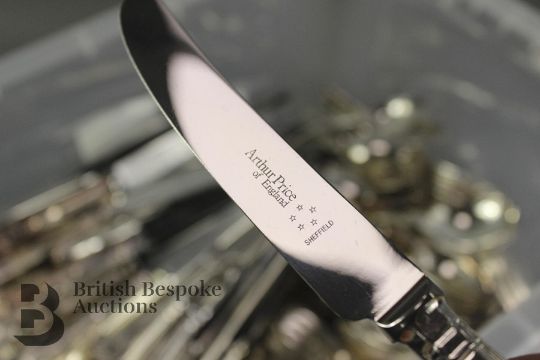Miscellaneous Arthur Price and other flatware. The lot comprises of various quantities including fourteen large forks, thirty small forks, six serving spoons, fifteen soup spoons, sixteen dessert spoons, four coffee spoons, fourteen teaspoons, three fish knives, four fish forks, thirteen knives and twenty nine small knives, unboxed but in overall good condition.