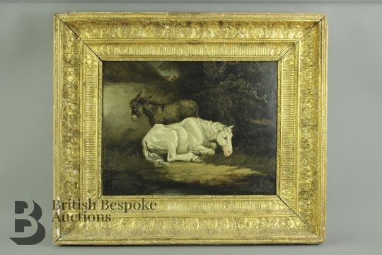 19th century oil on canvas, depicted a horse and mule, approx 30 h x 40 w cms, gilt plaster frame, unsigned.