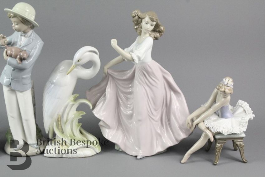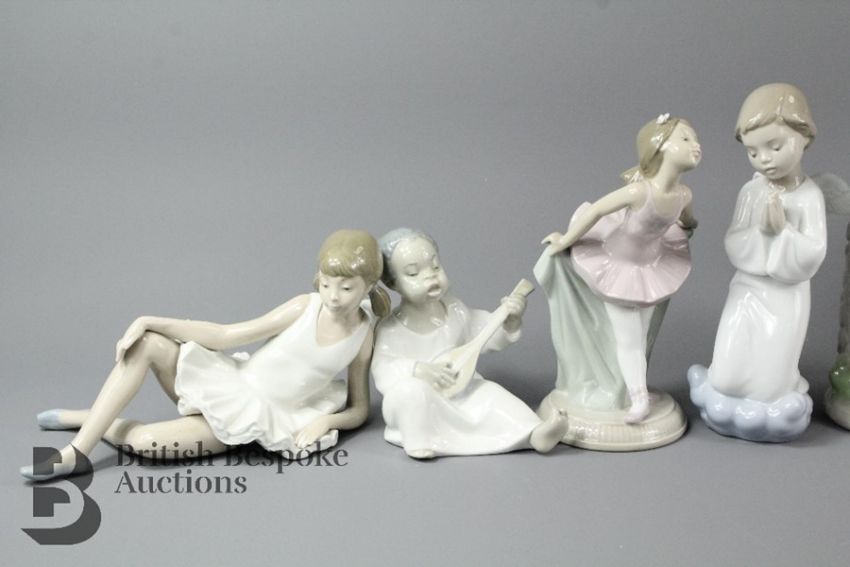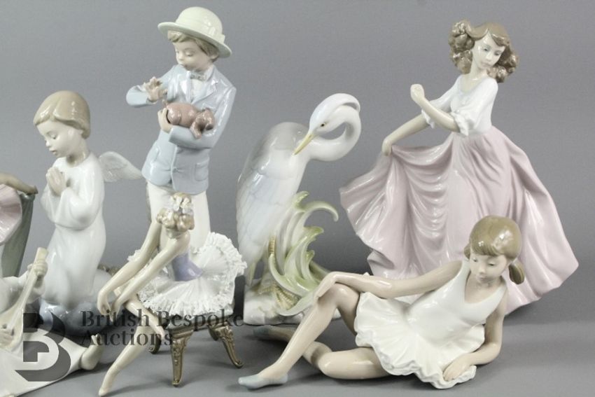 Quantity of Nao and Lladro figurines, including an angelic figure, Lladro ballerina, Lladro girl in a dress 6543 (af),Lladro angel, Nao ballerina, Nao praying angel, Nao ballerina, Nao boy with puppy and Japanese porcelain heron figurine (8)