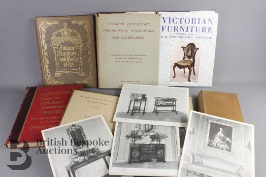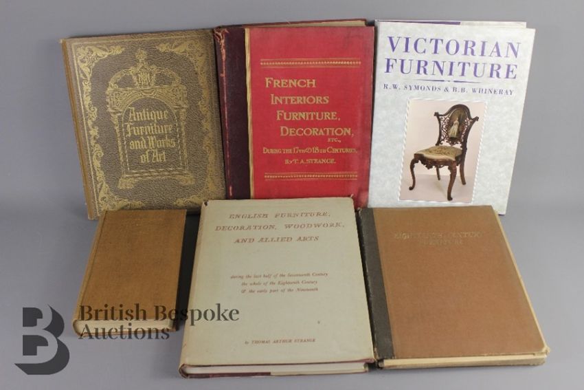 Six Antique Industry Reference Books, including (i) 17th,18th and 19th century English Furniture Woodwork, Decoration, (ii) Woodwork and Allied Arts; French Interiors Furniture and Decoration by T.A Strange the first is published 1950 5th impression with 3.500 illustrations hardback in jacket and the second two has no date but inscription for Gillows of Lancaster 1904, great works of reference, very well illustrated. (iii) Old English Furniture of 15/16/17th and 18th centuries by G.Owen Wheeler 1924 and a (iv) Catalogue of 18th century furniture by The Manor House USA.(v) Introductory Catalogue of Antique Furniture and Works of Art, M. Harris & Sons, New Oxford Street, London plus (vi) Victorian Furniture by Symonds and Whineray Studio Editions 1987.