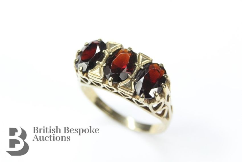 9ct yellow gold garnet ring, set with three garnets approx 8 x 5mm, size M, mm SJ London hallmark dated 1975/6, approx 3.6 gms.