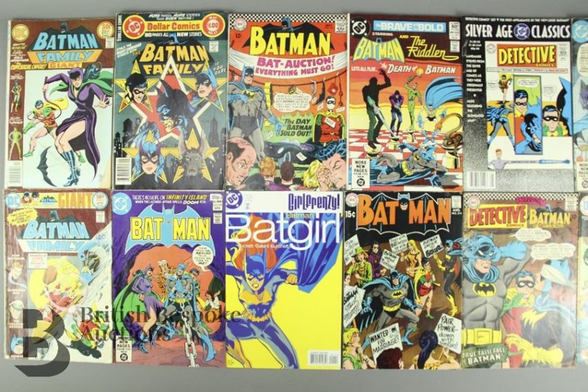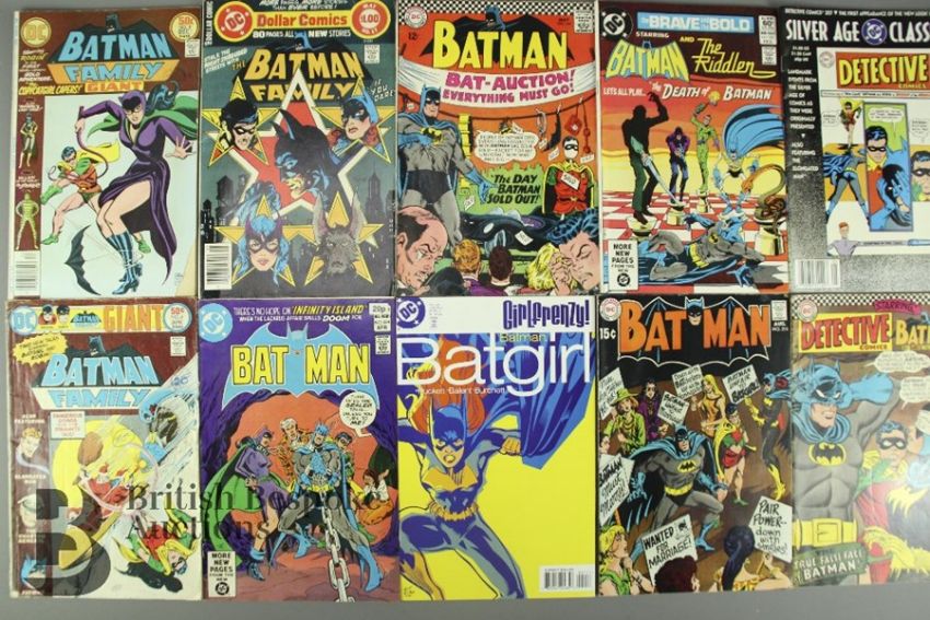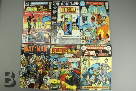 A collection of DC Batman comic books, including 'Detective Comics' May 1967 issue 363, 'The Brave and Bold' March 1974 issue 111, 'Detective Comics' July 1981 issue 504, 'Silver Age Classics' May 1992 issue 327, 'Batman' August 1969 issue 214, 'Brave and The Bold' February 1982 issue 183, 'Batman' May 1967 issue 191, 'Batman Family' May 1978 issue 17, 'Batman Family Giant' November 1976 issue 8, 'Batman Family' April 1976 issue 4, 'Batman' April 1981 issue 334, 'Batgirl' June 1998 issue 1.