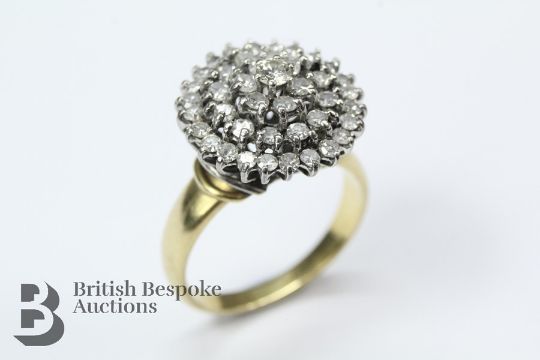 Lady's 18ct yellow and white gold cluster ring. The diamonds set in an elevated pyramid setting, approx 1 x 10 pts of dias and 84 pts of eight-cut dias, colour I, clarity VI1, size R, approx 7.79 gms.