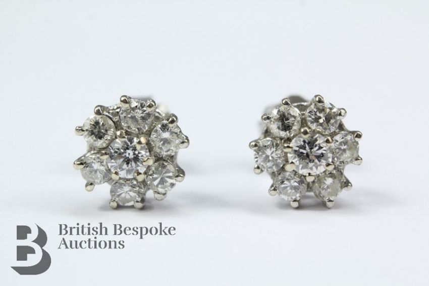 Pair of 18ct white gold diamond cluster earrings, each earring set with seven diamonds, the centre diamond approx 15pts and the surrounding dias approx 16 pts, colour H, SI1/2, gross weight approx 2.8 gms.