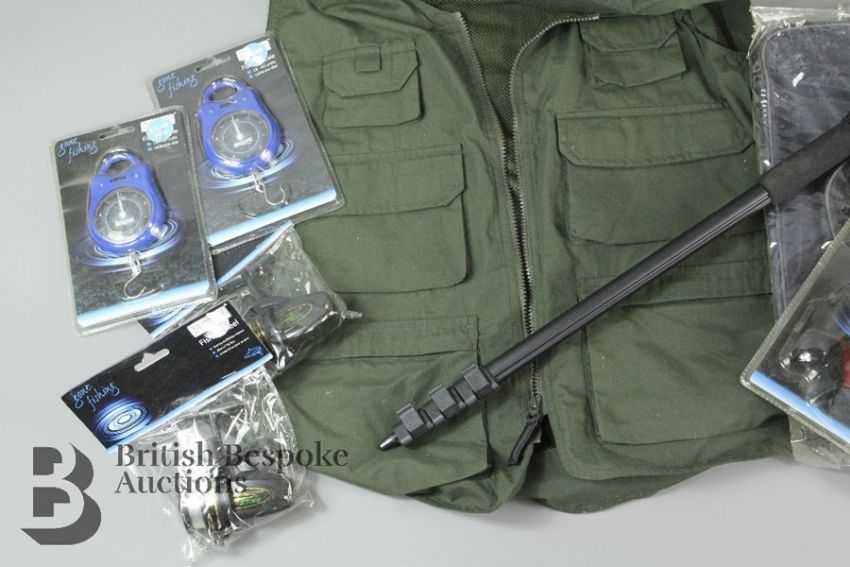 Miscellaneous fishing box containing misc sea fishing lures, Daiwa 1000c spinning wheel, misc. lures, line etc, plus three new Gone Fishing fishing reels, two new Gone Fishing scales, new multisection tackle box, and two bait kit bags, and Leeda fishing waistcoast and fishing rod rest.