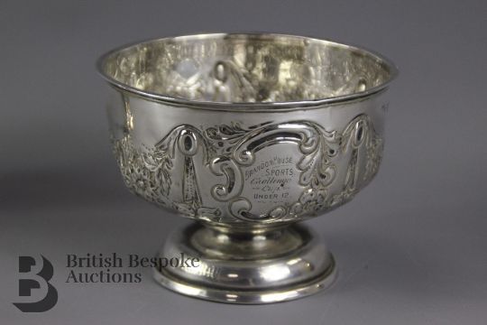 An Edwardian sugar caster, Birmingham hallmark, dated 1905, mm WR (rubbed), approx 245 gms together with a silver trophy bowl Birmingham hallmark, dated 1902, mm EH (rubbed) approx 140 gms and a silver cigarette box approx 10 x 10 x 5 cms marks rubbed. (3)