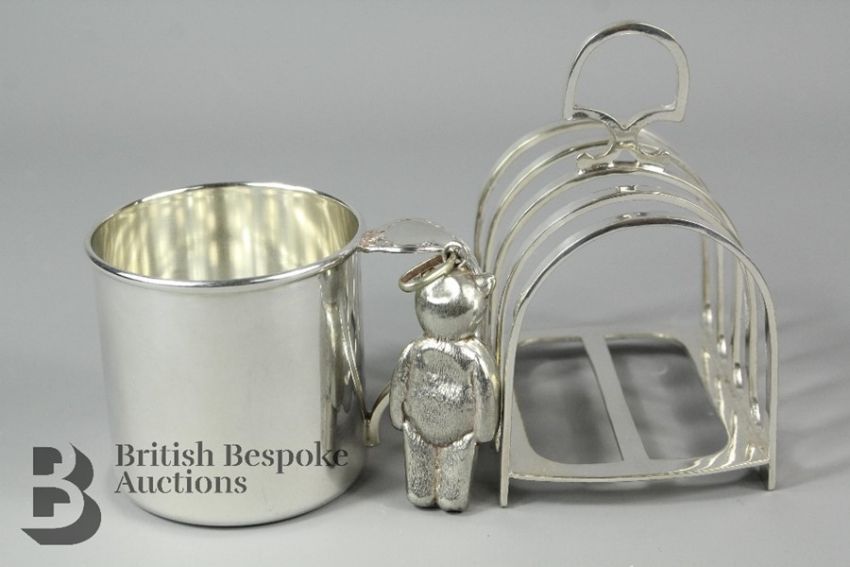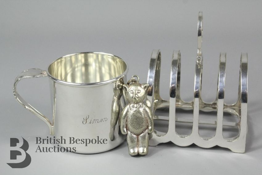 Miscellaneous silver plate, including; a silver plated toast rack, a silver plated small christening mug engraved 'Simon', and a small silver plate teddy (possibly from a baby rattle or teething ring)