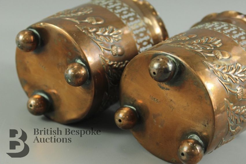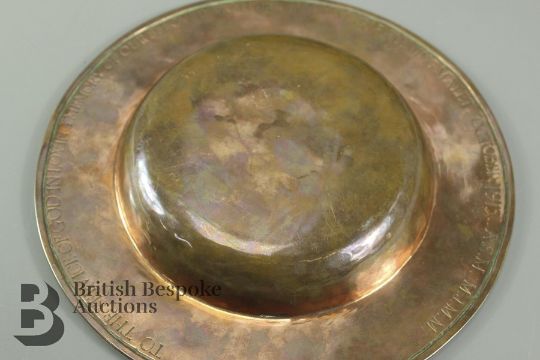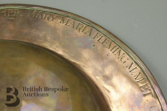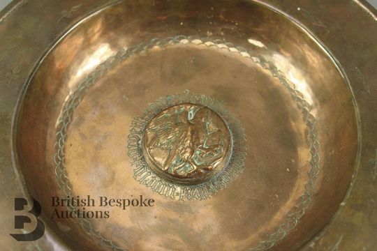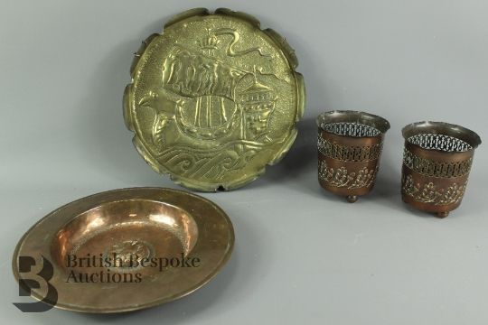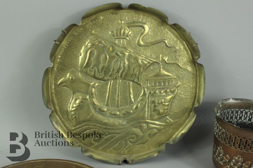 Miscellaneous copper and brass, including a copper (Arts and Crafts Alms dish) engraved to the verso 'Loving memory of Mother October 1913' approx 25 cms d, a pair of copper miniature jardiniere stamped JS & S approx 10 cms h, having oak leaf and acorn motif and a brass wall plaque depicting a medieval sailing ship approx 26 cms d.