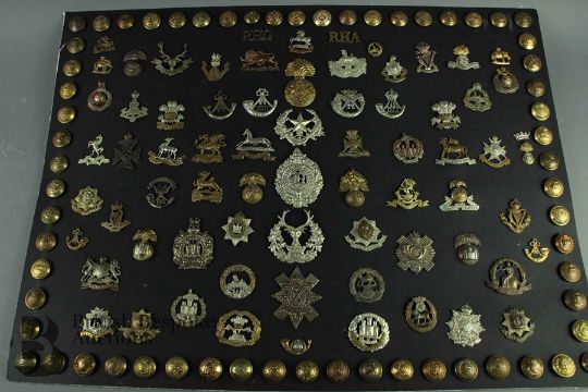 A splendid carded display of British Infantry O/Rs cap badges and buttons, mostly WWI period.