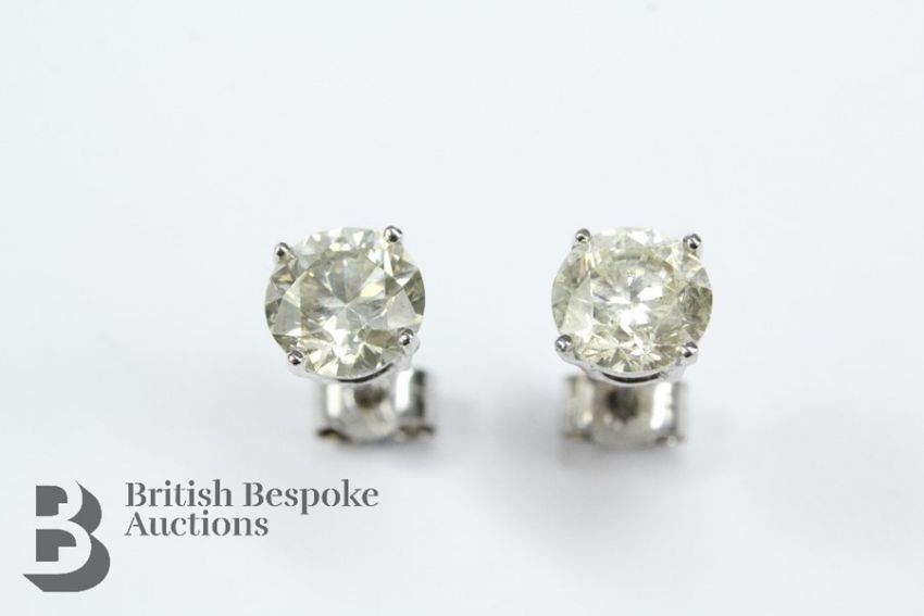 Pair of 14/15ct white gold diamond stud earrings, set with two diamonds approx 85 pts, total 1.70 cts, clarity SI, colour I/J, SI2 clarity.