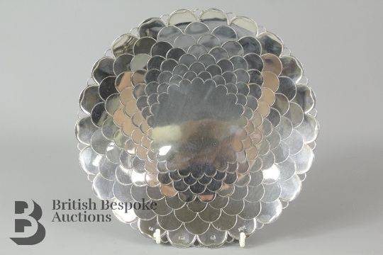 Mappin and Webb Silver fruit stand with shaped engraved edge, the bowl having a chrysanthemum design, Sheffield 1963(?), 23cm d, 5cm h, 446 gms