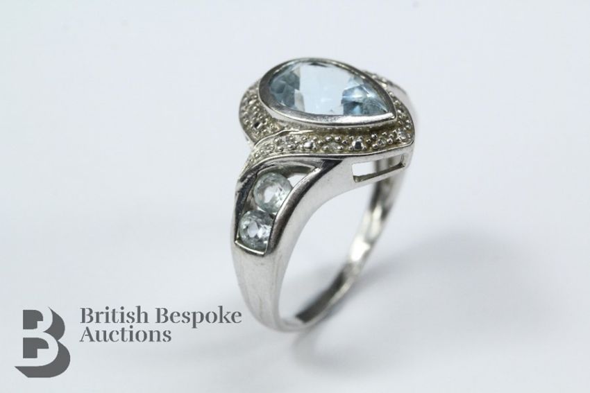 9ct gold topaz and diamond ring, stamped 375, the pear-shaped topaz measures approx 10 x 8mm and flanked by two circular topaz and approx 3 pts of dias, size N, approx 4.5 gms.