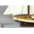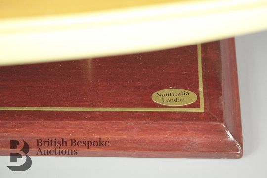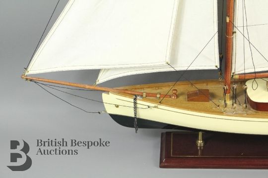 A large wooden classic yacht model sailboat AS135 by Authentic Models with three sails, detailed rigging and an anchor on a wooden and brass stand. The boat measures 61cm in length, 91cms sail rigging length, and 86cm in height.