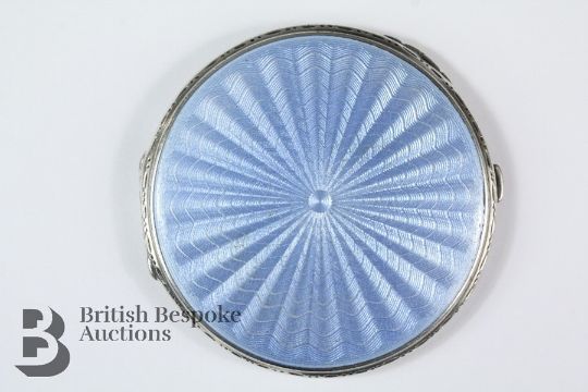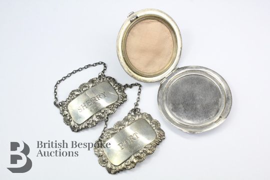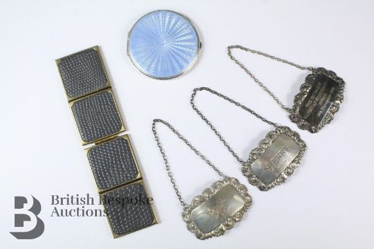 Miscellaneous silver, this lot includes blue enamel and silver compact, two silver liquor labels, (Sherry, Port).