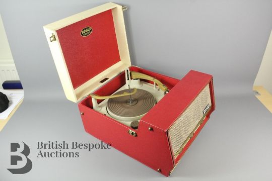 1960s Dansette record player, vintage, the case in tones of red and cream bakelite and composite plastic.