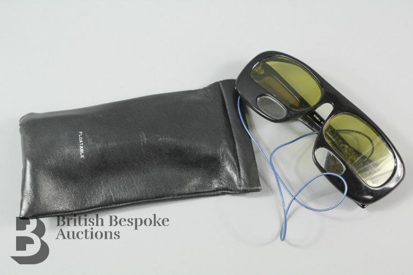 A vintage Fenwick Woodstream PSU 1265 10 1/2' (320) 3.6oz lure 15-30lb line 22oz (616g) two piece sea fishing rod and another FS85 two piece, with a vintage aluminium Bache Brown Spinster spinning wheel, and vintage Umco model 173-P tackle box, L.L.Bean waist bag and fishing glasses.