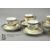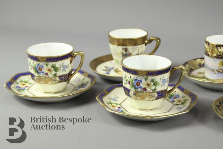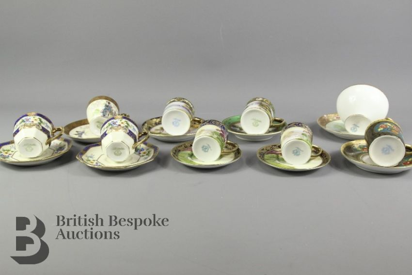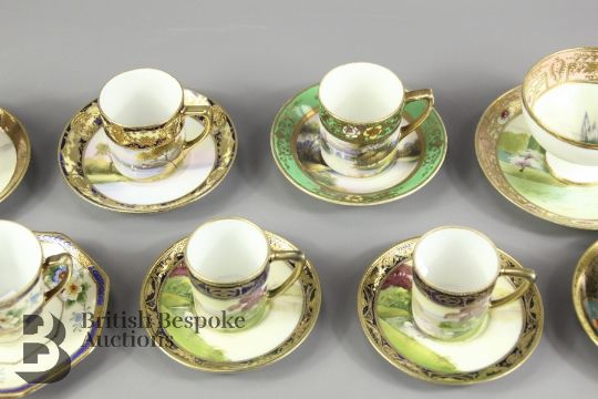 Nine Noritake tea cups and saucers with various floral and landscape designs, heightened with golden accents. All tea cups in good condition with no chips, cracks or breakages, only some minor wear to handles. One saucer has a small chip to the rim but otherwise all saucers in good condition.
