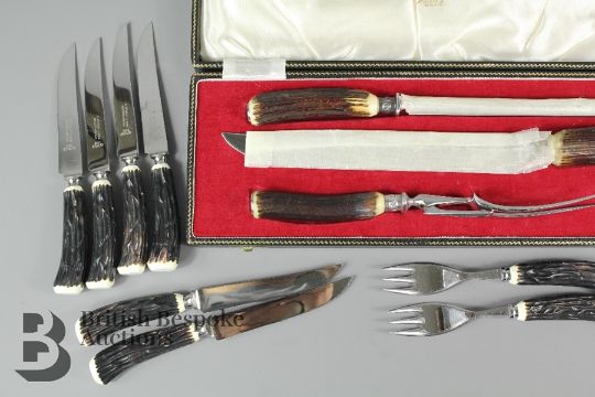 A Boxed Carving Set, unused boxed steel and horn-handled carving set with sterling silver collars, Butler Sheffield, England, together with 6 faux-horn handled steak knives and forks.