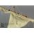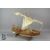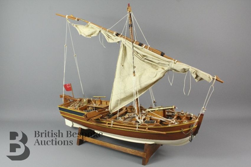 A large wooden sailboat model with single triangular sail, 10 oars and 3 cannons and cannonballs on a wooden stand. Boat measures 51cms in length, 59cm in sail rigging and 52cm in height.