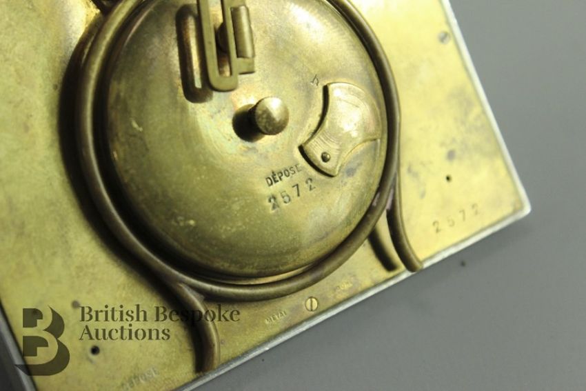 Art Deco bedside clock, with silver and enamel frame, white enamel face with baton numerals, luminescent hour and minute hands, Depose movement, approx 9 x 7 cms.