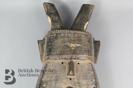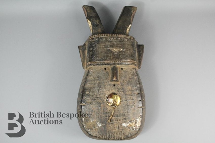 West African mask, wood carved, exaggerated jaw line with applied metal plating (majority missing), de-emphasized features, approx 38 w x 45 cms excluding horns.