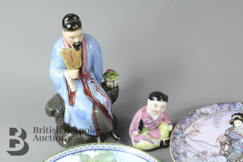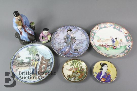 Miscellaneous Chinese porcelain collectors including Princess of the Iris MB5049 and plates from the Imperial Jingdezhen porcelain factory painters include Pao Chai, Yuan Chun, Hsi Feng, Miao Yu, Ying Chun, Tai Yu, Li Wan, Ko Ching, Hsiang Yun, Tan Chun together with two ceramic figurines, four Chinese wall hangings and a Minton cabinet plate depicting figures in a garden setting, approx 23 cms d.