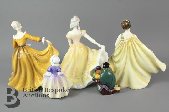 Five Royal Doulton porcelain figurines; including Alexandra HN 2398 (1969), Ninette HN 2379 (1970), Kirsty HN 2381 (1970), The Old Balloon Seller HN 2129 (1928), Dinky Do HN 1678 (1935).