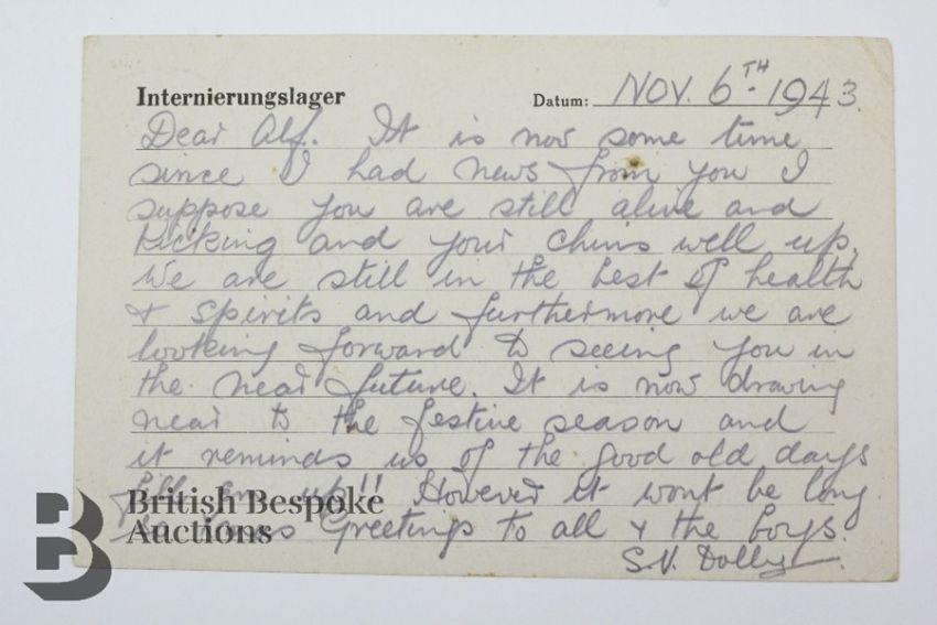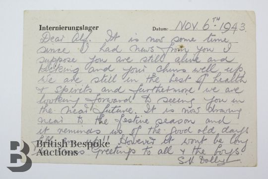 Jersey WWII German occupation. A 1941 prisoner of war card from J Gates in Stalag XXA in Torun Poland to his wife in Jersey and a scarce 1943 internment card from Mrs S V Dolby in Wurzach internment camp in Germany to Mr and Mrs Blake in Jersey.