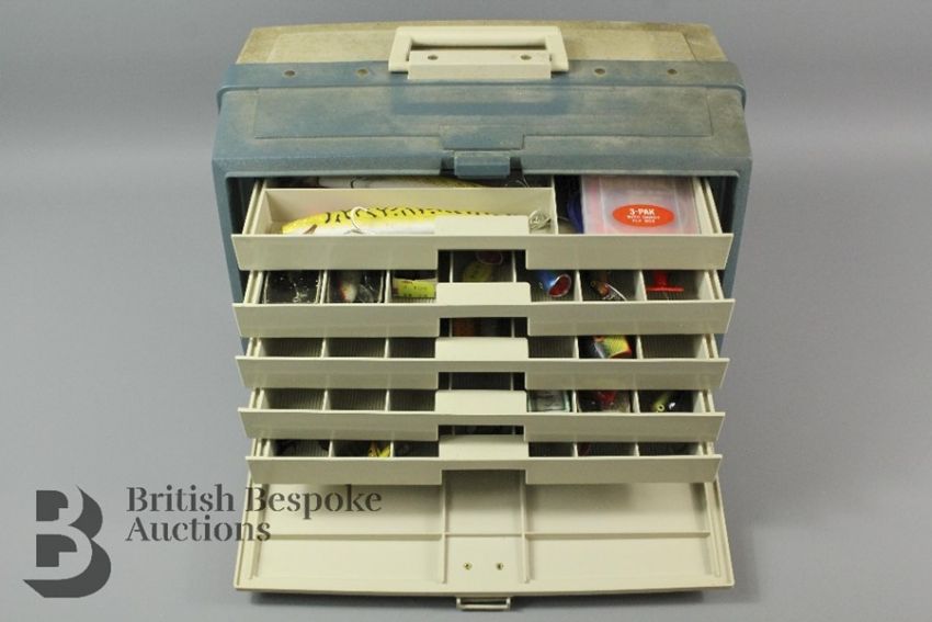 Miscellaneous sea fishing equipment including Plano vintage lure box containing misc. sea lures and poppers, a vintage Oba split cane 4 piece sea rod including extra tip - needs some re-whipping.